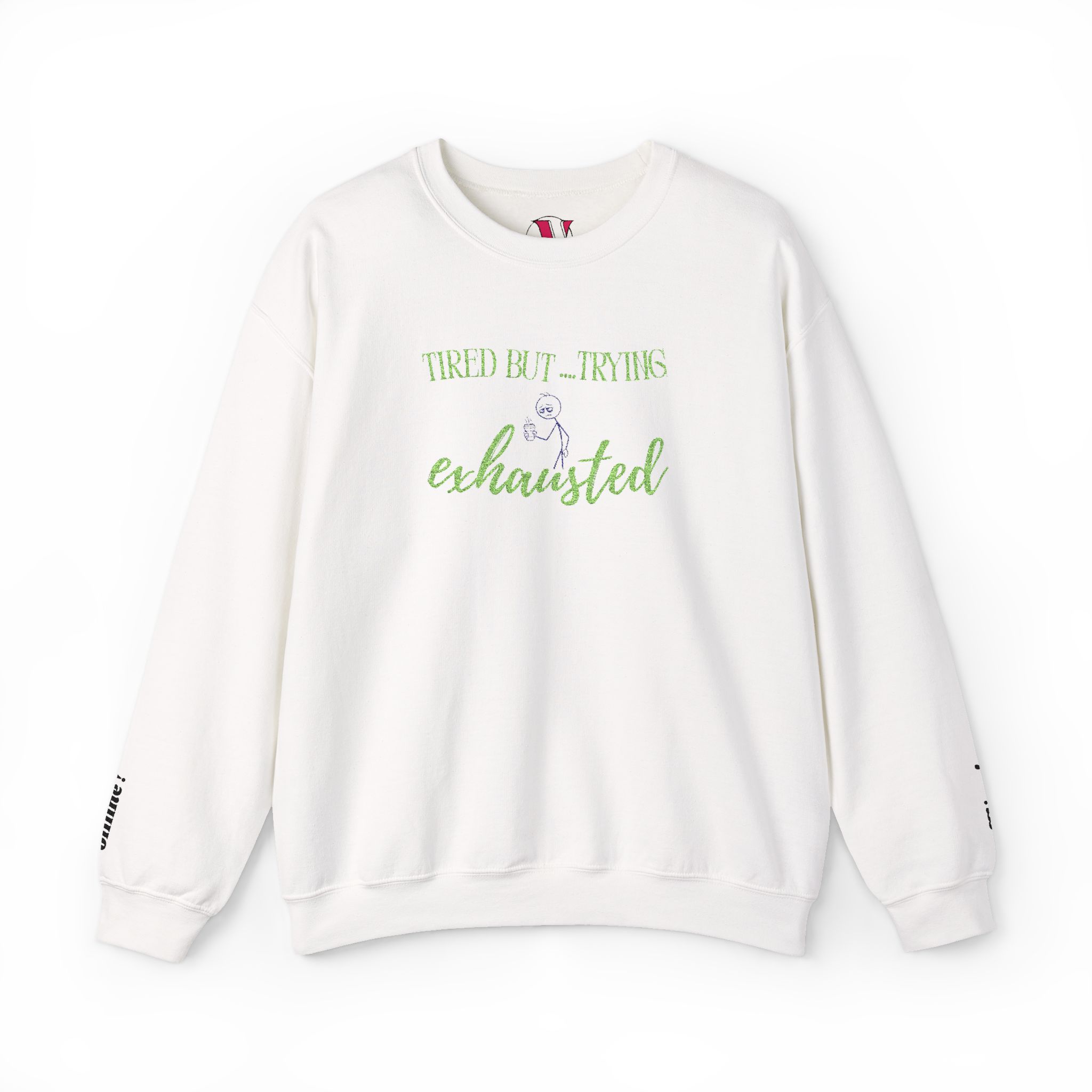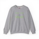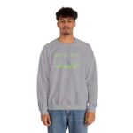 This relaxed crewneck sweatshirt carries a quiet, slightly wry mood—soft white fleece with delicate green embroidery that reads like a private joke. The small centered script and subtle wrist text sit low-key against the clean silhouette, so it feels lived-in and lightly styled rather than loud. Wear it on slow mornings, post-hike coffee runs, or late-night study sessions when you want comfort that still speaks your language. The medium-heavy cotton-poly blend drapes nicely, holds shape, and keeps the embroidered details crisp, so the look stays thoughtfully simple wash after wash.