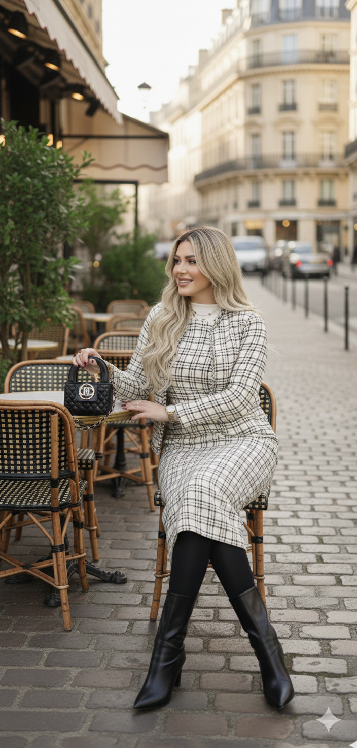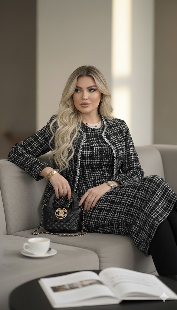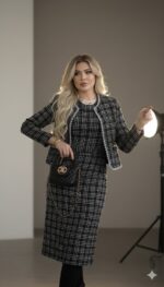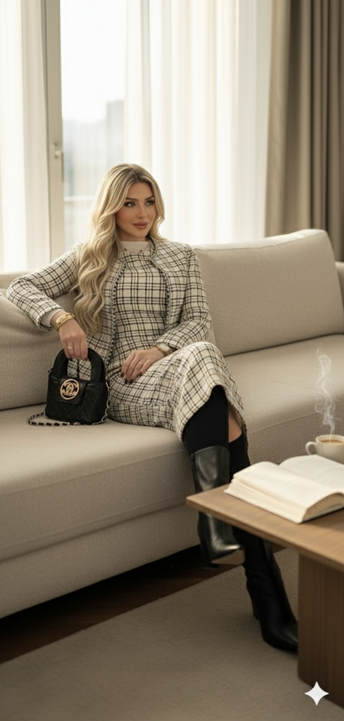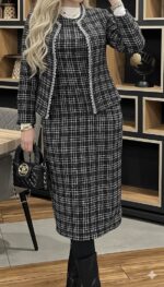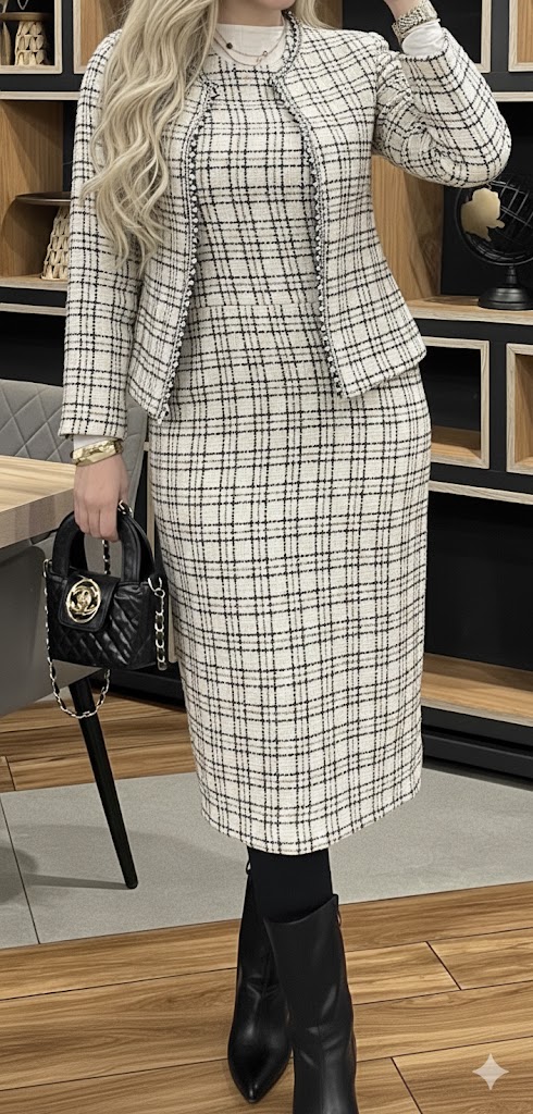 A sophisticated two-piece tweed set featuring a fitted midi dress and a matching open-front jacket. Designed for modest elegance with a tailored silhouette, soft textured tweed, and timeless neutral tones—perfect for work, events, and refined everyday style.