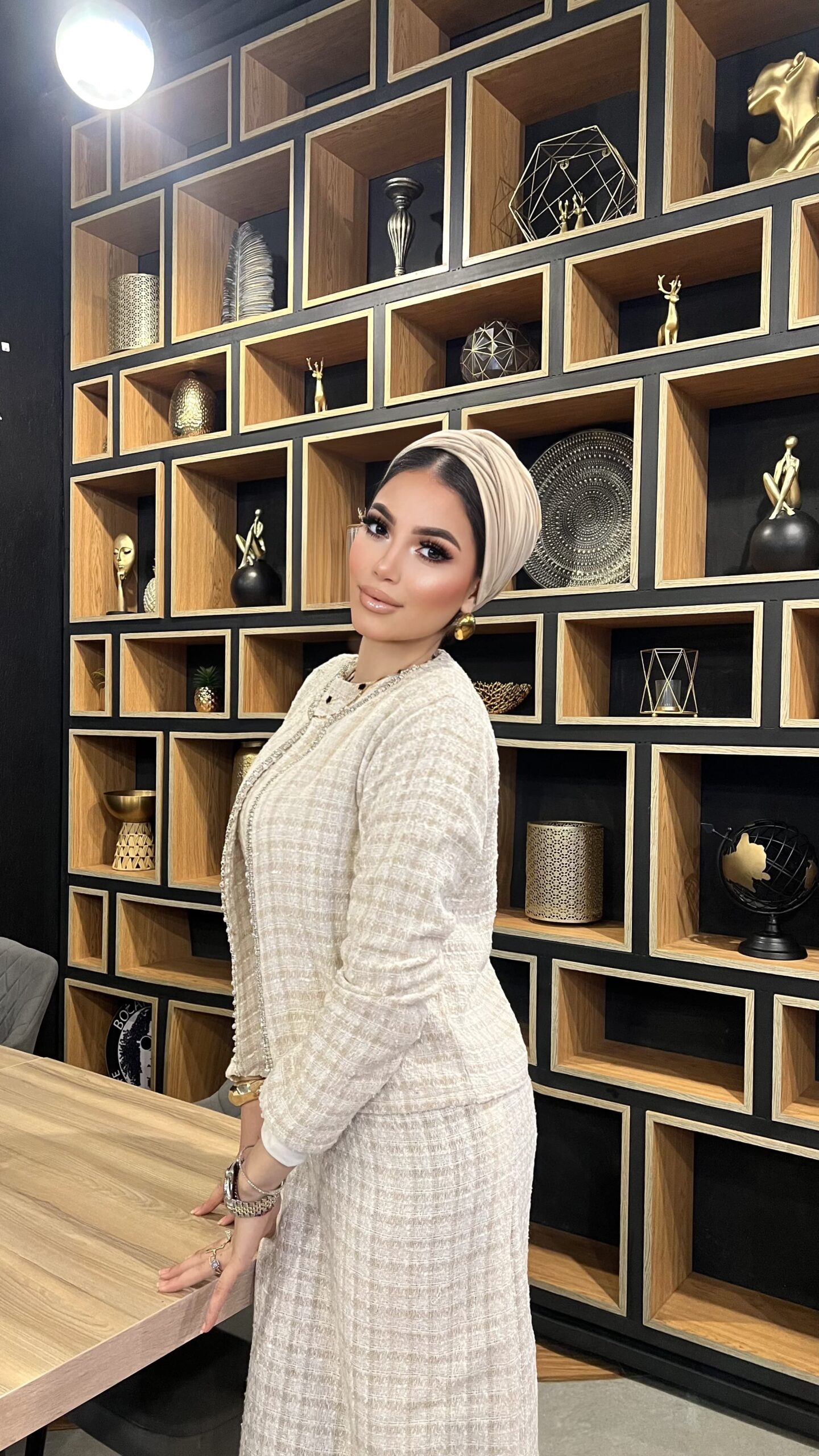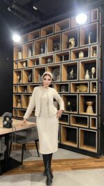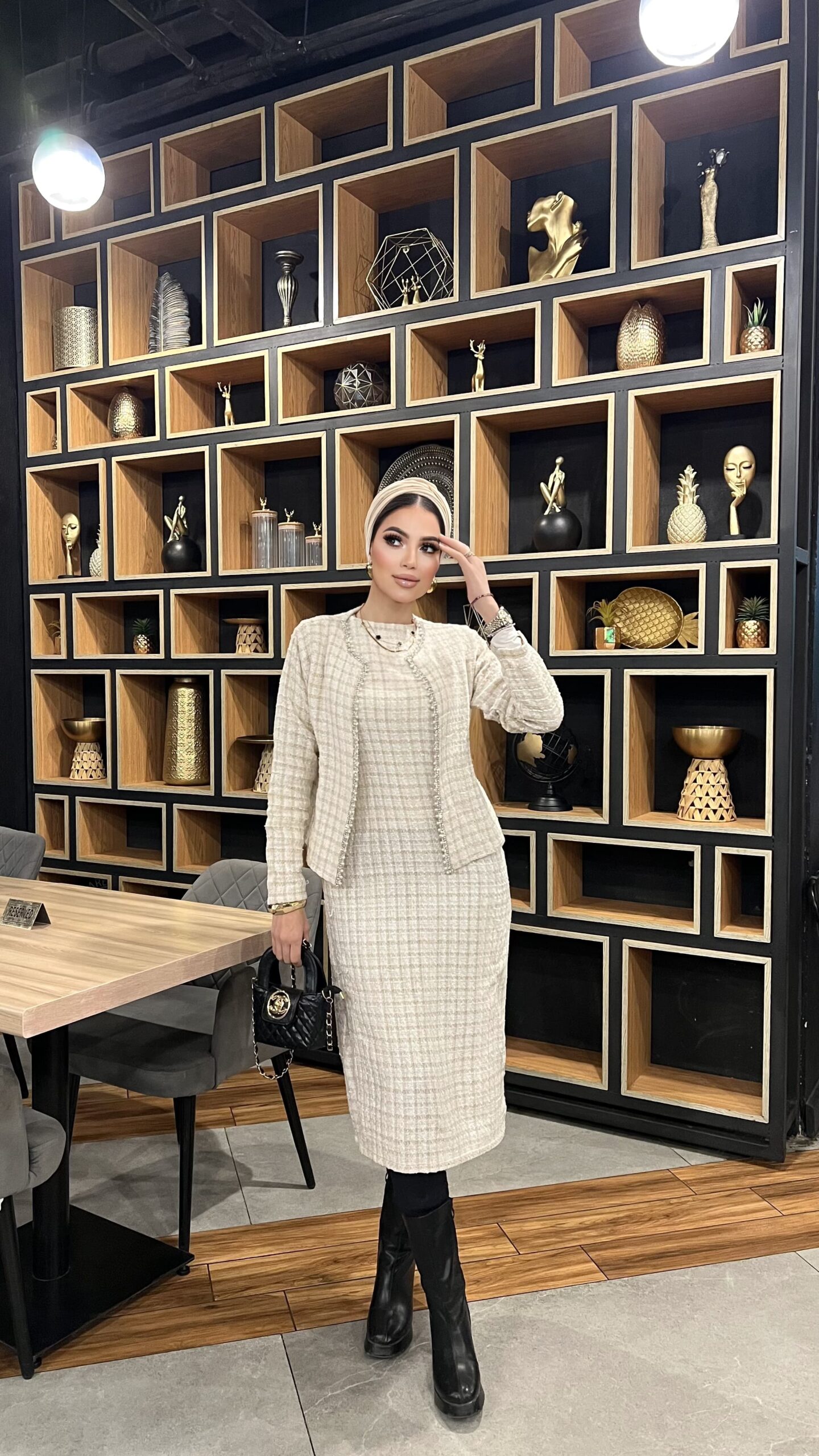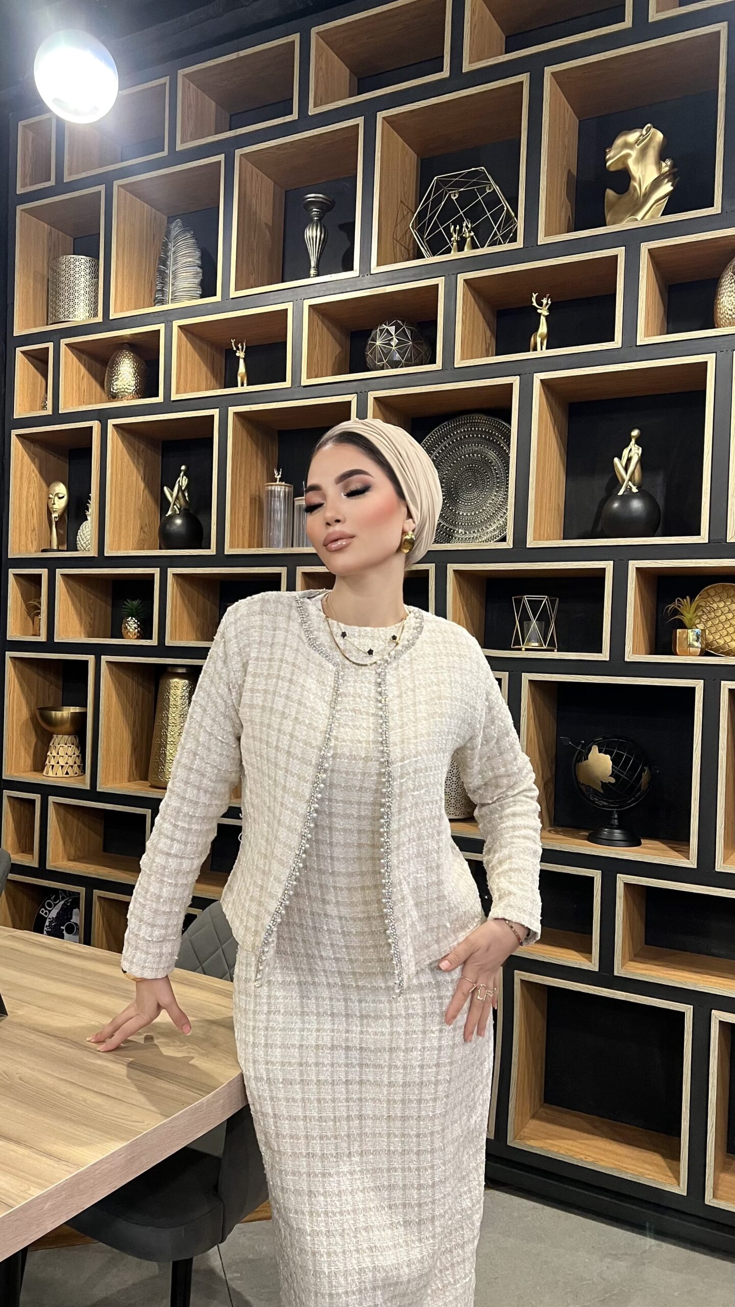 A sophisticated two-piece tweed set featuring a fitted midi dress and a matching open-front jacket. Designed for modest elegance with a tailored silhouette, soft textured tweed, and timeless neutral tones—perfect for work, events, and refined everyday style.
