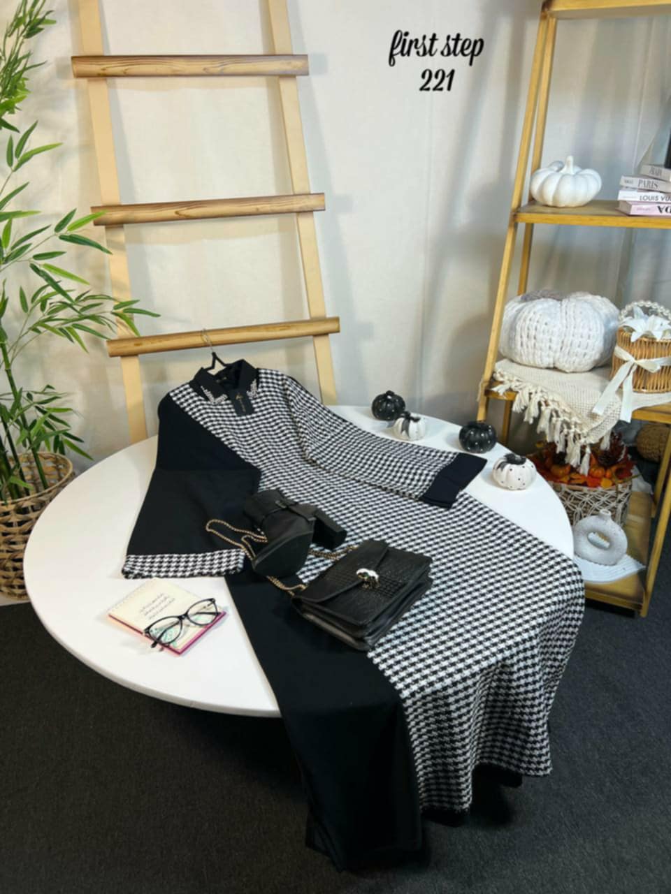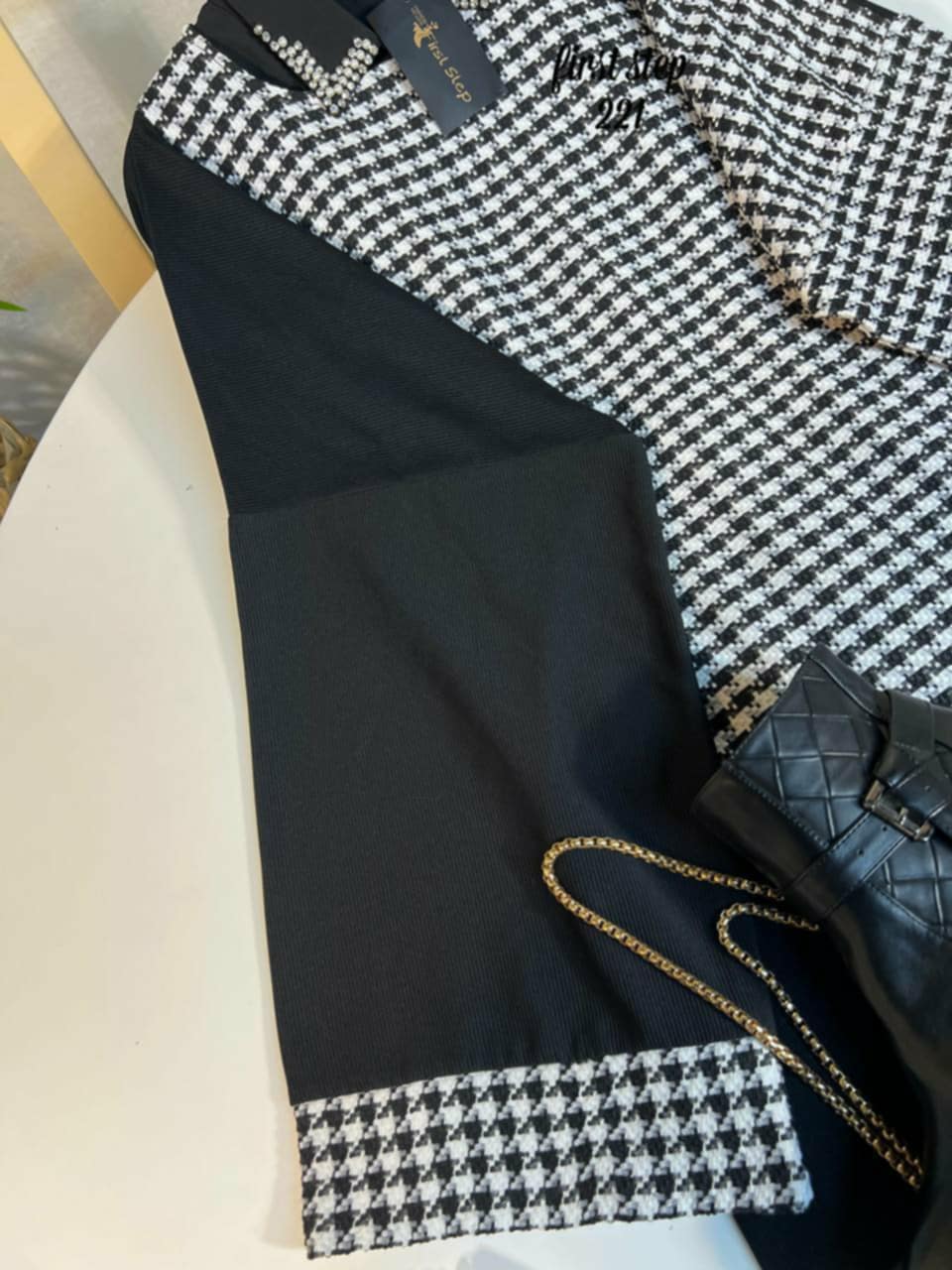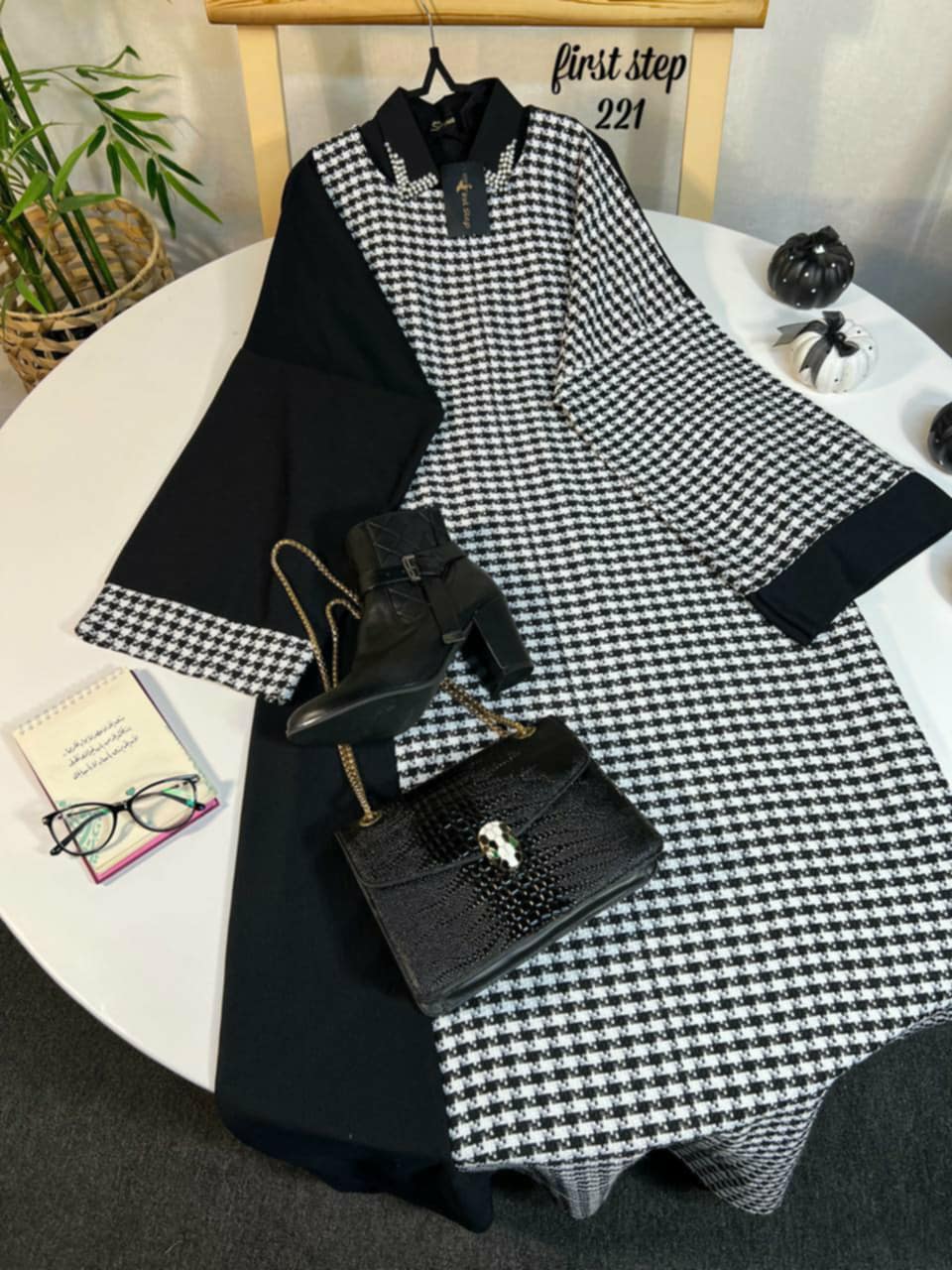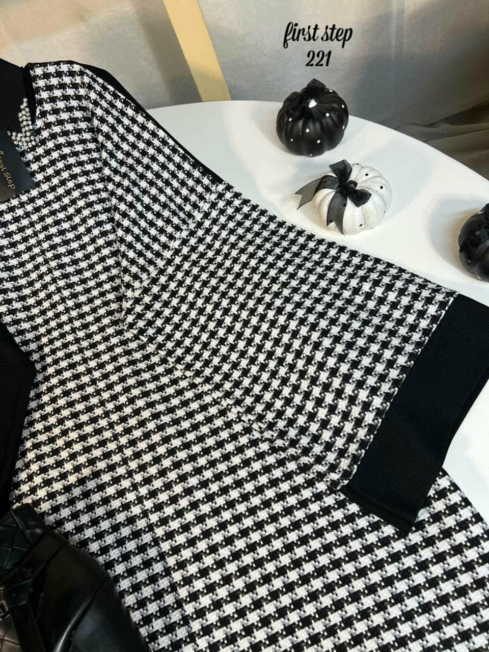 - Black-and-white houndstooth fabric with a classic yet eye-catching design